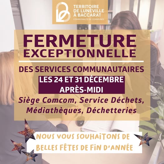 📌✨Les services de la Communauté de Communes du Territoire de Lunéville à Baccarat seront exceptionnellement fermés au public 📅 les 24 et 31 décembre 2025 après-midi. Cela concerne notamment : ✅Le siège de la Communauté de communes ✅Le service de Gestion et Prévention des Déchets ✅La médiathèque l’Orangerie à Lunéville…